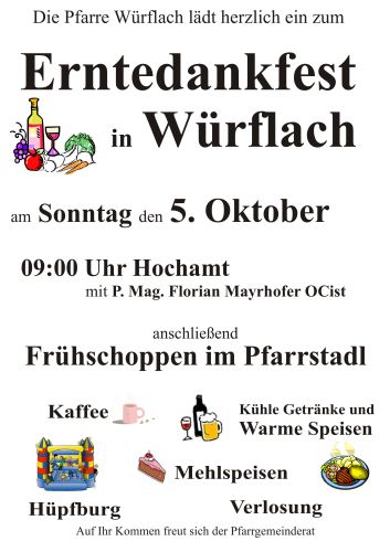Wir könnten Erntedank auch als Fest des Fest des „Nicht-Selbstverständlichen“ bezeichnen. Ein Fest des Staunens und der Achtsamkeit. Ein Tag, an dem das „Deo gratias!“, das „Gott sei Dank!“, nicht ehrlich und innig genug sein kann. Warum? Erntedank soll mehr als ein Anlass sein, um seine Dankesschuld vor dem Herrgott zu absolvieren. Dieses Dankesfest erinnert den Menschen, dass er sich im Grunde seiner Existenz selbst jemand verdankt. Dem Leben und der Liebe seiner Eltern, der Gnade und der Liebe Seines himmlischen Schöpfers! Das ganze Fest motiviert uns dazu! In der Heiligen Messe feiern wir das ewige Dankopfer an Gott für die Gabe der Erlösung. Im anschließenden Frühschoppen erleben wir den Segen von guter Gemeinschaft, köstlichem Essen und schwungvoller Musik. Auch für die Kinder ist mit der Hüpfburg und einem Kindermenü gesorgt. Mit Spannung erwarten wir die große Verlosung, und Vieles weitere! Herzliche Einladung! Schaut’s vorbei!