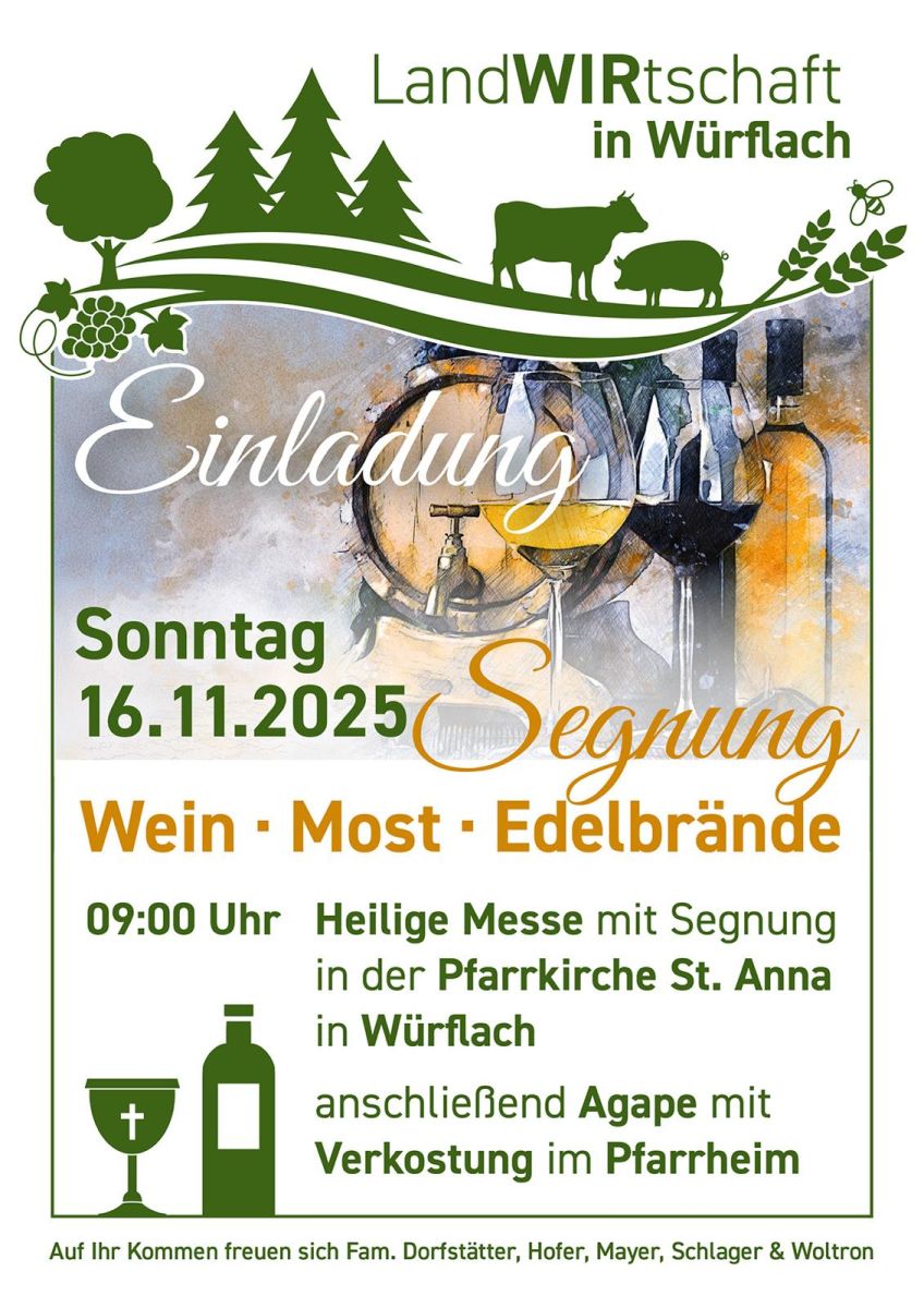 Fasslrutschen in Klosterneuburg war gestern! Wir in Würflach lassen die Tradition der Weintaufe wieder hochleben! Am So, 16. November segnen wir um 9:00 Uhr in der Hl. Messe edle Tropfen. Wein, Most und Schnaps aus Würflach und dürfen sie anschließend im geheizten Pfarrheim verkosten. In vielen Weinbaugebieten Österreichs wird seit Jahrhunderten im Herbst, wenn der junge Wein „geboren“ ist, eine Weintaufe gefeiert. Der neue Jahrgang erhält dabei einen Namen, wird gesegnet und symbolisch „getauft“. Die Tradition hat ihren Ursprung im Christentum: Im Mittelpunkt stehen der Dank und die Bitte um Gottes Segen für die Früchte der Erde und die Arbeit der Winzer. Der Brauch stammt aus dem Mittelalter, als der junge Wein – der „Heurige“ – zum ersten Mal probiert wurde. Die Weintaufe bringt das Geschenk der Schöpfung bewusst in den Glauben ein: Der Wein dient als Erinnerung an die Hl. Eucharistie, in der Brot und Wein zum Zeichen der Gegenwart Christi werden. Durch unsere Weintaufe möchten wir die Verbindung von Glaube, Gemeinschaft und Tradition festigen – und zugleich danken für alles, was wächst und reift, im Weinberg und in unseren Herzen.